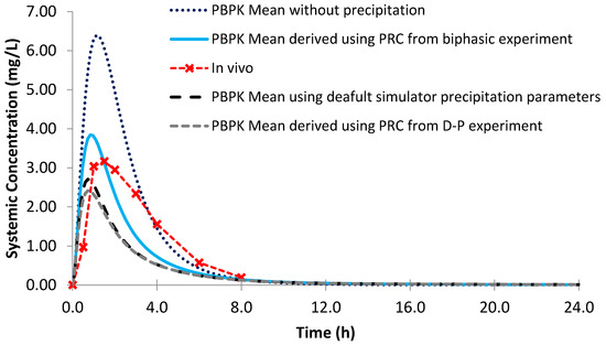 In addition, the PK parameters estimated from the plasma profiles simulated using the PRC and CSR values from the in vitro experiments performed in the present study were compared with those estimated from the plasma profiles simulated using the default values for PRC and CSR in Simcyp software (4 h−1 and 10, respectively) and using models in which no in vivo precipitation was simulated.