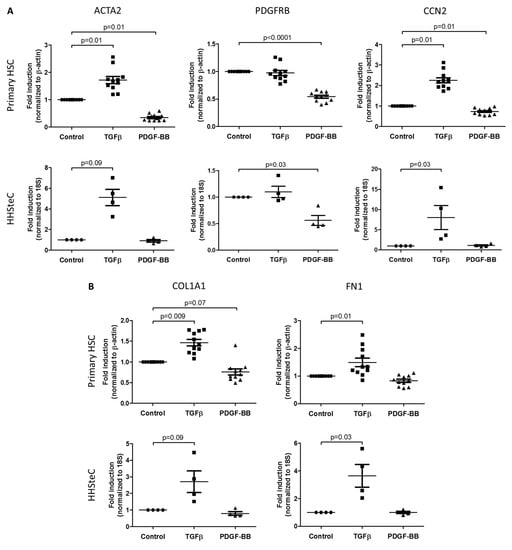 3.2. TGFβ- and PDGF-BB-Related Fibrotic Responses in Primary Human Hepatic Stellate Cells