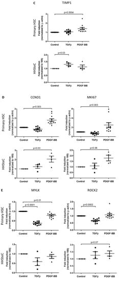 Upon stimulation with PDGF-BB, proliferation genes were markedly increased in both the primary HSCs (CCND1 78.6% ± 15.1%, MKI67 151.2% ± 49.8%) and the HHSteCs (CCND1 105.9% ± 32.7%, MKI67 79.4% ± 25.4%) (Figure 2D). The inflammatory gene CXCL8 was increased as well (598.9% ± 247.0% in primary HSCs and 1743.4% ± 684.1% in HHSteCs, respectively) (Figure 2G). Moreover, TIMP1 and CCL2 expression were clearly induced by PDGF-BB in the primary HSC cultures (40.6% ± 12.6% and 79.8% ± 20.7%) (Figure 2C,F). Remarkably, several activation genes that were increased after TGFβ stimulation were significantly expressed lower in primary HSCs (ACTA2 64.9% ± 3.85%, PDGFRB 45.8% ± 2.7%, CCN2 26.8% ± 4.8%) and in HHSteCs (PDGFRB 43.9% ± 9.31%) after incubation with PDGF-BB (Figure 2A). More genes were responsive in primary HSCs as compared to HHSteCs, particularly following PDGF-BB stimulation, showing the added value of these primary cells.