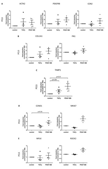 Well in line with the in vitro results, PDGF-BB stimulation clearly increased the expression of proliferation markers CCND1 and MKI67 (86.4% ± 37.7% and 165.0% ± 47.3%), TIMP1 (335.6% ± 118.0%) and COL1A1 (180.6% ± 73.4%) (Figure 3B–D). Additionally, the chemotactic gene CCL2 is expressed higher compared to the untreated control (99.9% ± 49.7%) (Figure 3F).