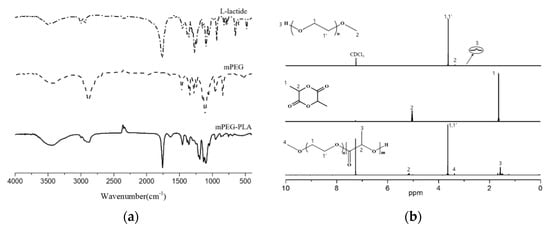 (a) FT-IR and (b) 1H-NMR spectra of L-lactide, mPEG and mPEG-PLA.