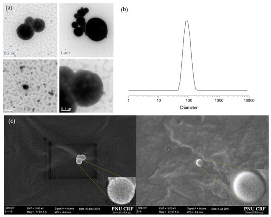 The nanoparticles were also examined by transmission electron microscopy (TEM, JEOL JEM-1400, Tokyo, Japan), and field emission-scanning electron microscopy (FE-SEM, Carl Zeiss AG SUPRA25, Oberkochen, Germany). Double emulsion structures of nanoparticles were confirmed by fluorescence microscopy (Meiji Techno MX-6300, Saitama, Japan). The results of FE-SEM, TEM, and fluorescence microscopy were helpful to confirm the size and morphology of encapsulated structures.