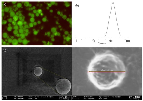 From the fabrication of FITC-loaded PFU nanoparticles as an indicator of encapsulation, as shown in Figure 5a, it was confirmed that FITC was successfully encapsulated in PFU nanoparticles as detecting brighter spots inside of nanoparticles. FE-SEM images of these nanoparticles showed a porous and wrinkly spherical morphologies with an average diameter of approximately 250 nm. Good agreement of the average size of nanoparticles was also obtained from DLS results, which is an appropriate size for endocytosis of nanoparticles in drug delivery system (Figure 5).