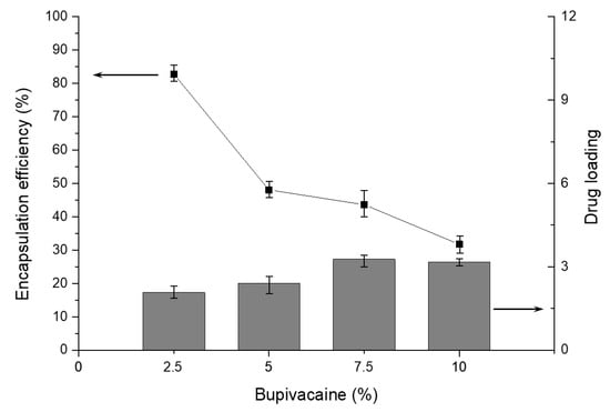 Bupivacaine percentages of 2.5%, 5%, 7.5% and 10% were encapsulated into nanoparticles and encapsulation efficiency and drug loading were investigated. Encapsulation efficiency was highest when 2.5% bupivacaine was encapsulated. The encapsulation efficiency decreased as the concentration of bupivacaine increased (Figure 6).