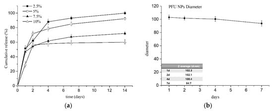 As shown in Figure 7a, the drug release behavior of bupivacaine-loaded PFU nanoparticles showed sustained release profile especially at low loading concentrations of bupivacaine. Except for 10% bupivacaine-loaded nanoparticles, all groups showed sustained release profiles. Due to both relatively higher cumulative ratio and longer period release of bupivacaine than other concentrations, the nanoparticles with 2.5% of bupivacaine could be selected as the optimized drug concentration. The characteristic features such as biodegradability, encapsulation by water-in-oil-in-water double emulsion techniques, and prolonged release could increase the anesthetic effect of bupivacaine while decreasing its side effects, such as cytotoxicity and cardiac arrest. The physiological stability of these PFU nanoparticles was also evaluated by in vitro test in pH 7.4 phosphate-buffered saline (PBS). The PFU nanoparticles were suspended in PBS at 37 °C using shaking water bath and the size changes of PFU nanoparticles were continuously monitored by DLS for 7 days. The stability assay showed that PFU nanoparticles remained stable in PBS showing an acceptable size variation for up to 7 days (Figure 7b). This supports that PFU nanoparticles could undergo bulk degradation, meaning that the particle size can be maintained during degradation process, because the rate of water penetration into nanoparticles is faster than rate at which the polymer is degraded, which is commonly observed for aliphatic polyesters including polyglycolide, polylactic acid and polyfumarate [,,].