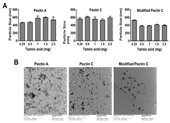 Effect of tannic acid content in the formation of pectin-tannic acid (TA) nanocomplexes. (A) Particle size variation upon changing the TA content in the preparation of pectin A-, pectin C-, and modified pectin C-tannic acid nanocomplexes. Formulation composition: 0.5 mg modified pectin, 0.25–2.5 mg tannic acid (the total volume of reaction was 1 mL). The particle size data was reported as a cumulative average of 3 min readings. (B) Morphological variation of pectin-tannic acid nanocomplexes. Representative transmission electron microscopic images of pectin A-, pectin C, and modified pectin C-tannic acid nanocomplexes. Direct magnification 50,000×. The scale bar on TEM images represents 500 nm.