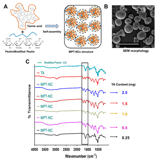 Confirmation of the formation of nanocomplexes based on modified pectin and tannic acid (MPT-NCs). (A) Schematic representation of the self-assembly formation process for producing modified pectin-tannic acid nanocomplexes. (B) Representative scanning electron microscopy image of MPT-NCs. Direct magnification 10,000×. (C) ATR-FTIR spectra of modified pectin, TA, and MPT-NCs. Data present the average of 32 scans. The highlighted portion on FTIR spectra indicates modified pectin and tannic acid cross-linking due to hydrogen bonding between carboxylic and hydroxyl groups.