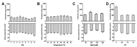 Stability and environmental influence for MPT-NCs’ formulation as a function of time, temperature, pH, and salinity. Dynamic light scattering measurement of particle size and zeta potential of MPT-NCs for (A) time (Day 1 to Day 9), (B) temperature (15 to 45 °C), (C) salinity (25 to 200 mM NaCl), and (D) pH (3 to 7.4). The data presented are expressed as the mean ± SEM, n = 3. Particle size measurements were the accumulation of 3 min readings, and zeta potential measurements were of 20 measurement for 90 s.