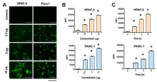 Cellular uptake of MPT-NCs by pancreatic cancer cell lines. Coumarin-6 dye was conjugated with MPT-NCs to image and track nanoparticles under a microscope and by flow cytometry. (A,B) Dose dependent cellular uptake behavior of MPT-NCs in HPAF-II and PANC-1 cells. (A) Fluorescence images and (B) flow cytometry-based cellular update phenomenon of 2.5, 5, and 10 µg Coumarin 6-containing MPT-NCs for 3 h of incubation. The scale bar on fluorescence images indicates 200 µm. (C) Flow cytometry cellular uptake pattern of 5 µg Coumarin 6-containing MPT-NCs at 1, 3, and 6 h, respectively. Data are expressed as the mean ± SEM, n = 3. * p < 0.05 of MPT-NCs treatment vs. control cells.