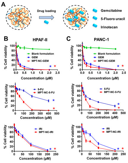 Anti-cancer potential of MPT-NCs against pancreatic cancer cell lines. (A) Schematic illustration of drug loading procedure in MPT-NCs. (B,C) Cell viability of HPAF-II and PANC-1 as a function of GEM, 5-FU, and IRI concentration and drug containing MPT-NCs. * p < 0.05 of GEM, 5-FU, and IRI concentration and drug containing MPT-NCs compared to un-treated/control cells. Data are presented as the mean ± SD, n = 5.