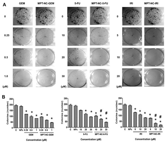 MPT-NCs inhibit the colony formation of PANC-1 cells. (A) Representative images of colonies for the predetermined treatment groups (control/blank MPT-NCs and drug containing MPT-NCs). (B) Total number of colonies quantified using ChemDoc software. Data represented as the mean ± SEM, n = 3. * p < 0.05 of GEM, 5-FU, and IRI concentration and drug containing MPT-NCs compared to un-treated/control cells, and # p < 0.05 of drug containing MPT-NCs compared to GEM, 5-FU, and IRI treated cells.