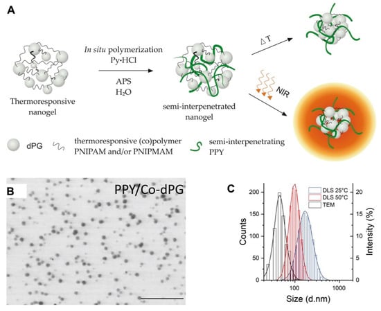 (A) The scheme for synthesis of dual responsive nanogels via semi-interpenetration method. The N-isopropylacrylamide (NIPAm)-based polymer network and interpenetrated polypyrrole (PPY) enabled the nanogels with thermoresponsive property and near-infrared (NIR)-induced photothermal convention, respectively; (Pyrrole∙HCl (Py∙HCI) as the base and ammonium persulfate (APS) as an initiator were introduced for polymerization); the TEM images (B) and hydrodynamic size distribution (C) of PPY/Co-dPG nanogels. Adapted from (Journal of Controlled Release. 2019, 311–312, 147–161). Copyright (2020) with permission from Elsevier Science.