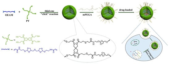 In recent decades, emergent hydrogels and nanogels have been associated with click chemistry due to its high reactivity, high yield and superb selectivity []. Click chemistry, which includes the copper(I)-catalyzed azide-alkyne (CuAAC) click reaction, the copper-free click reaction, and pseudo-click chemistry, has become the most promising strategy for the preparation of nanogels. For instance, a pH-responsive nanogel was obtained through thiol-ene click chemistry, an efficient method of nanogel preparation without byproducts, by polymerization with methoxy polyethylene glycol acrylate (mPEGA), pentaerythritol tetra(3-mercaptopropionate) (PT) and ortho ester diacrylamide (OEAM) []. The network of the obtained nanogels was introduced to capture the molecule doxorubicin (DOX), and acid-labile monomer OEAM enabled the DOX-loaded nanogel displayed a pH-triggered release profile with the intracellular acidic environment (Figure 2).