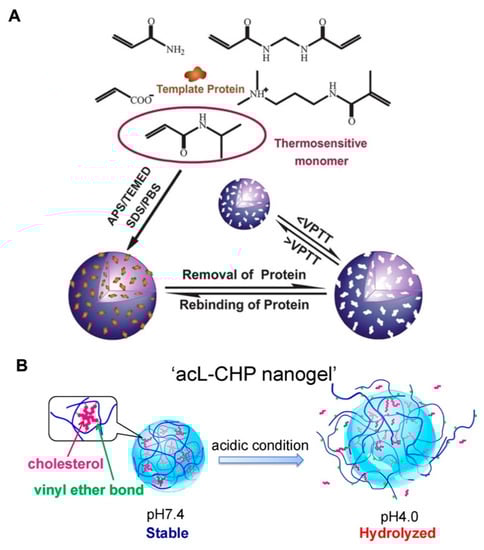(A) Schematic illustration of the aqueous imprinting method for protein-loaded thermoresponsive nanogels (with APS as an initiator and sodium dodecyl sulfate (SDS) as an emulsifier). The change in temperature below or above VPTT enabled the removal or rebinding of protein. Republished with permission of Royal Society of Chemistry, from [Soft Matter, 2013, 9, 3840–3850. Edition Number 38, Copyright (2013)]; permission conveyed through Copyright Clearance Center, Inc. (B) By hydrolysis of cholesteryl vinyl ether bond at pH 4.0, the acid-labile cholesteryl-bearing pullulan nanogels (acL-CHP) resulted in swelling-collapse and presented the acid-triggered drug release. Adapted with permission from (Biomacromolecules 2013, 14, 56-63). Copyright (2013) American Chemical Society.