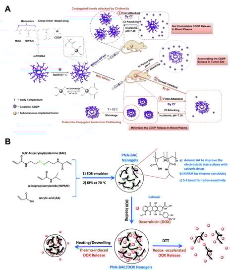 Monoresponsive nanogels cannot maintain the controlled drug release effectively, so nanogels with dual- or multi-stimuli responsiveness have attracted widespread attention [,,,]. Among the multiresponsiveness combinations, pH–temperature dual-sensitivity combinations have been studied with considerable advances. Peng and coworkers innovated a kind of dual-stimuli nanogel polymerized from NIPAm, MAA and PEGMA that responded to temperature and pH values. The cross-linked p(NIPAm-MAA-PEGMA) nanogels displayed the excellent drug loading and release behavior for hydrophilic model drugs with different molecular weights []. Furthermore, the p(NIPAm-MAA-PEGMA) nanogels were introduced as the pH-thermal dual responsive carriers for loading cisplatin (CDDP), which was conjugated with the COOH group from MAA, and the release could be triggered by H+ and Cl− attack. The thermoresponsive nanogels could reduce the Cl−-triggered drug release during circulation, while the acidic environment in the tumor region would achieve the controlled release of CDDP, improving antitumor efficacy and alleviating adverse effects (Figure 4A) []. Besides the physical condition, the intracellular responsive release of glutathione (GSH), an essential antioxidant that specifically reduces the disulfide bonds, was reported at a relatively high concentration in cancer cells (approximately 2–10 mM), which is approximately 1000 times the value of approximately 2–20 μM in normal cells []. The monomers NIPAM and AA were crosslinked by N,N’-bis(acryloyl)cystamine (BAC) to prepare the PNA-BAC nanogels with thermo, pH-, and redox-sensitivity for DOX delivery []. In this research, triple-responsive PNA-BAC-DOX nanogels displayed the accelerated DOX release in the presence of 4 mM DTT, which mimicked the tumor cell environment. Meanwhile, the acidic conditions were beneficial for the DOX release from PNA-BAC-DOX nanogels, which was in accordance with the tumor microenvironment (Figure 4B).