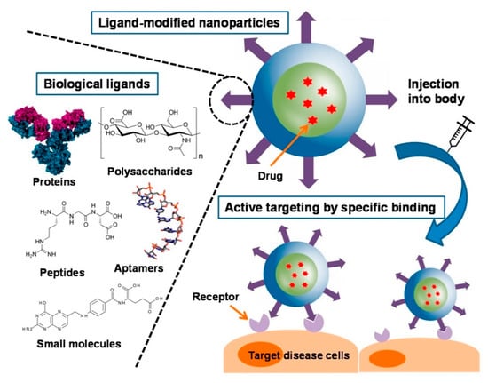 Like other types of NP, nanogels can be provided not only passive targeting ability by adjustments to their size, shape or surface property, but also active targeting by their surface modification, further improving the accumulation of drugs in disease region []. Active targeting can be achieved through the interaction of ligands and specific cellular or subcellular receptors. Moreover, the biological ligands such as small molecules, proteins, peptides, polysaccharides were employed for the surface modification of NPs (Figure 5) [].