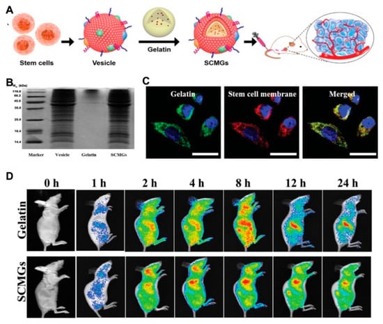 (A) The scheme illustrated the preparation of mesenchymal stem cell membrane-coated gelatin nanogels (SCMGs) and the tumor targeting property; (B) the surface protein analysis of SCMGs to certify the cell membrane coating; (C) confocal fluorescence images for the cell uptake of SCMGs which illustrated the colocalization of green labeled gelatin nanogels and red labeled stem cell membranes; (D) in vivo fluorescence imaging of mice after intravenous injection of SCMGs, that illustrated the enhanced tumor targeting and prolonged circulation after stem cell membrane coating. Reprinted with permission from (Small. 2016, 12(30), 4056–4062). Copyright (2016) Wiley Online Library.