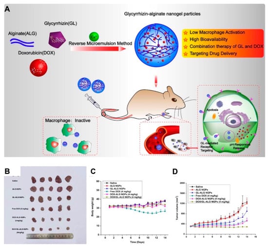 (A) The schematic illustration of alginate nanogel co-delivered with glycyrrhizin and doxorubicin (DOX/GL-ALG NGPs) for the improved anticancer therapy by inactivated macrophage and targeted drug delivery; the antitumor effect: photograph of tumors (B), body weight variation curve (C) and tumor growth curve (D) for each group after treatment. Reproduced from (Theranostics. 2019, 9, 6239–6255. Ivyspring International Publisher) distributed under the terms of Creative Commons Attribution 4.0 International License (CC-BY license).