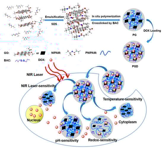 The schematic illustration of in situ polymerization of GO-hybridized nanogels (PG) and the DOX-loaded PG (PGD) with NIR laser-triggered and redox-responsive drug release, which exhibited the potentiality for combinational photothermal-chemotherapy. Adapted with permission from (ACS Appl. Bio Mater. 2018, 2, 330−338). Copyright (2018) American Chemical Society.