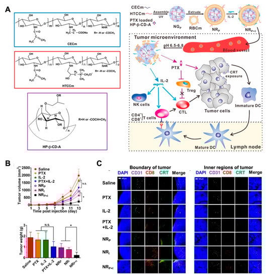 Polysaccharide-based self-assembly nanogels have been applied in tumor-associated antigen delivery in recent decades []. Daisuke M. et al. reported that the cholesteryl pullulan (CHP) nanogel could deliver a long peptide antigen (LPA) to the draining lymph node. By provoking a CD8+ T cell response through medullary macrophages, the CHP-based vaccine was proved the promising immunotherapeutic effect in animal models []. Unlike the directed induction of apoptosis or autophagy by the cytotoxic drugs, vaccine adjuvants or immunomodulators typically trigger antitumor immunity by regulating the tumor microenvironment [,,]. However, the limitations of tumor immunotherapy include the high cost of therapy, the difficulty of sustained systematic immunity, and low patient response. The application of nanomedicine combined with immunotherapy is considered to be a promising, safe, and efficacious tumor treatment strategy []. In this study, the modified cyclodextrin was combined with chitosan derivates to form the pH-sensitive nanogels for paclitaxel (PTX) loading. Then, the PTX-load NG was further coated by an erythrocyte membrane with interleukin-2 (IL-2) binding to construct the NRP+I nanoplatform for combinatorial immunotherapy. With the prolonged circulation and responsive drug release properties, the antitumor performance of NRP+I in the melanoma model was superior to that of free drugs or monotreatment. With co-delivery of PTX and IL-2 to the tumor region, the low-dosage of PTX release triggered the calreticulin (CRT) exposure on tumor cells and further induced the infiltration of CD8+ T cell into tumor tissue. Furthermore, IL-2 cytokine stripped from the membrane of NRP+I led to the activation of intratumoral cytotoxic T cells (CTLs) in the tumor microenvironment, which resulted in the synergistic effect of chemo-immunotherapy (Figure 11) [].