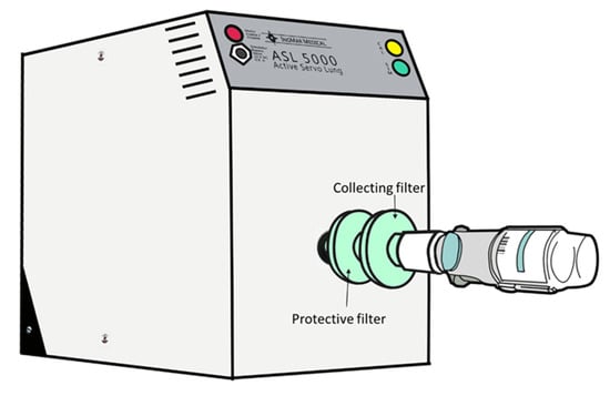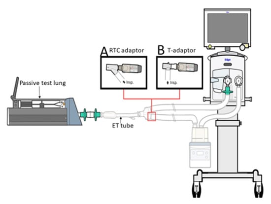 A Dräeger V300 ventilator (Dräeger Medical Systems, Lübeck, Germany) operated with volume control, tidal volume of 500 mL, respiratory rate of 15 breaths/min, inspiratory time of 1.3 s, inspiratory flow of 50 L/min in square flow waveform, positive end-expiratory pressure of 5 cmH2O, and inspired oxygen fraction of 0.21. A heated humidifier (Fisher and Paykel Healthcare, Auckland, New Zealand) was set to invasive auto-mode with a temperature of approximately 37 °C. The ventilator circuit was connected to a 7.5-mm ETT, attached to a collecting filter connected to a passive test lung model (Michigan Instruments Inc., Kentwood, MI, USA) with resistance of 5 cmH2O/L/min and compliance of 50 mL/cmH2O, simulating an adult COPD patient.