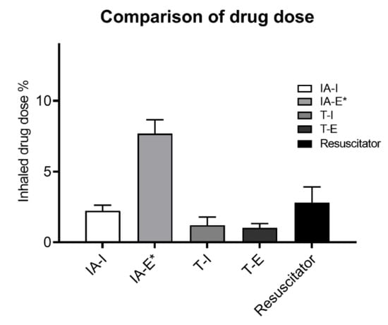 Comparison of the drug dose (%) collected distal to the endotracheal tube using different connections, actuation sequence, and methods of ventilation, * Significantly greater inhaled dose than other connections according to an analysis of variance (p < 0.001) and greater dose during expiration than inspiration with the in-line adapter. Abbreviations: IA-I: in-line adapter at inspiration; IA-E: in-line adapter at expiration; T-I: T-adapter at inspiration; T-E: T-adapter at expiration.