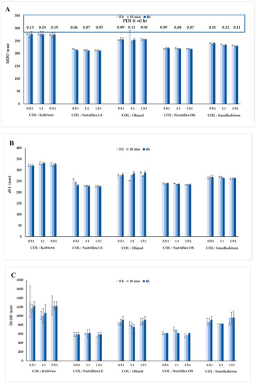 | Olimel + COL | 0.5:1 | 6.30 ± 0.00 | (1096 ± 8) → (1122 ± 6) → (1119 ± 5) | (−11.17 ± 0.21) → (−11.26 ± 0.08) → (−13.83 ± 0.21) |