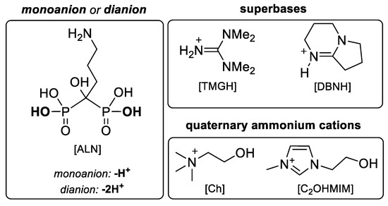 Structure of mono- and dianionic alendronate, protonated superbases and organic quaternary cations used to prepare the alendronic acid (ALN)–Organic Salts and Ionic Liquids (OSILs).
