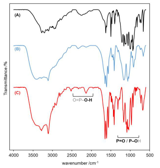 FTIR spectra of (A) ALN, (B) [TMGH][ALN] and (C) [TMGH]2[ALN].