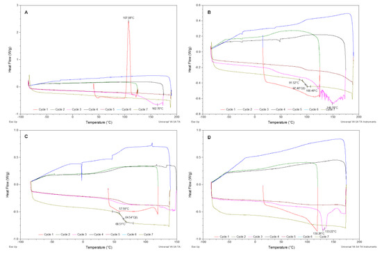 In comparison with sodium alendronate, which presents a melting temperature of 259.3 °C [26], all solid compounds melt at lower temperatures, more specifically between 130.3 and 162.7 °C, for [DBNH]- and [TMGH][ALN] OSILs, respectively. These melting temperatures are determined in the third cycle of the experiment, which consists of heating from −90 °C to 150–190 °C (depending on the compound) at 10 °C/min. The first two cycles typically consist of heating to 125 °C and isotherm for 15–20 min (for the complete removal of residual water) followed by cooling to −90 °C. From Cycle 3 onwards, consecutive cooling/heating cycles are performed at 10 or 20 °C/min. These cycles show glass transition temperatures (Tg) for the majority of the ALN–OSILs, showing that they become supercooled products, i.e., amorphous after the first melt. The exceptions to this behavior are [TMGH] and [DNBH][ALN], to which no glass transition nor crystallization (Tc) temperatures were observed in the experimental conditions. However, [TMGH][ALN] showed different behavior in comparison with the remaining ALN–OSILs in the first cycle, in particular a cold crystallization (Tcc) peak at 107.1 °C (Figure 3A).