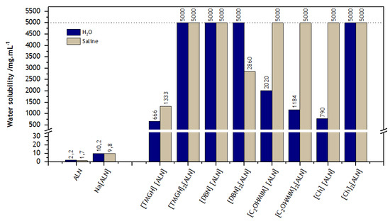 Solubility in water and saline solution at 37 °C of ALN, Na[ALN] and corresponding ALN–OSILs (detection limit is 5 g/mL, represented by the upper threshold).