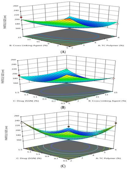 Response surface methodology for the effect of the formulation factors (X1, X2, and X3) on the particles size of SGN–TC nanoparticles. (A) Effect of polymer and crosslinking agent concentration on particle size, (B) Effect of crosslinking agent and drug concentration on particle size, (C) Effect of polymer and drug concentration on particle size.