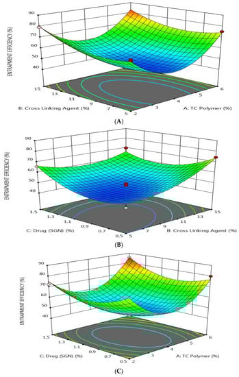 The effect of the three formulation factors on the EE % was explained using response surface plots (Figure 2). It was found that the EE % was increased as the concentration of TC, TPP, and SGN increased. This may be due to the rigid structure of prepared nanoparticles, due to the crosslinking between the TC polymer and TPP, which decrease the leakage of the drug []. This result was in full agreement with an earlier study which revealed that the formation of stronger disulfide bonds between TC and PO4− ion crosslinking indicated high drug entrapment efficiency [].
