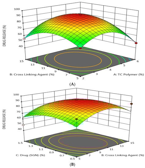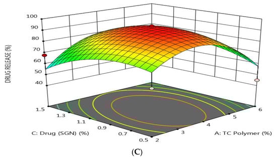 As shown by response surface methodology in Figure 3, it was found that the drug release was decreased by increasing the concentration of both TC and SGN and by decreasing the level of TPP. These results indicated that there was a direct relationship between the drug release and TPP concentration and an inverse relationship with both TC and SGN concentration. The results may be attributed to the fact that as the TC polymer increased, the diffusion path length increased and drug release was retarded [].