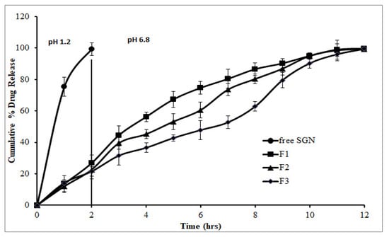 The drug release study was conducted in simulated gastric fluid for 2 h and then in simulated intestinal fluid for 10 h as the SGN has an absorption window in the stomach.