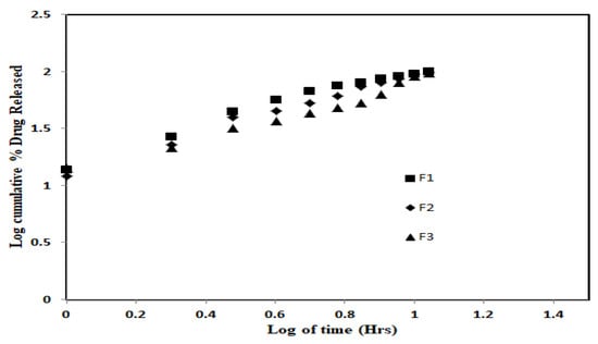 where Mt is the amount of drug released at time t, M∞ the nominal total amount of drug released, K the kinetic constant, and ‘n’ the diffusion exponent which is used to characterize the release mechanism. According to Ritger and Peppas equation, ‘n’ takes values in the range of 0.45–0.89 for the anomalous release mechanism. The value of ‘n’ with a regression coefficient for the prepared SGN–TC nanoparticles was found to be 0.874 for F1, 0.818 for F2, and 0.791 for F3, which gave an indication of the anomalous release mechanism (Figure 5). The anomalous diffusion mechanism of drug release revealed both diffusion and swelling controlled drug release from SGN–TC nanoparticles.
