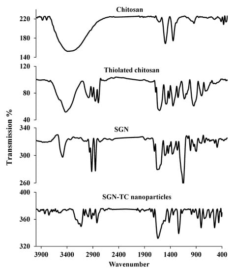 Fourier transform infrared spectroscopy (FTIR) of chitosan, thiolated chitosan, SGN, and SGN–TC nanoparticles.