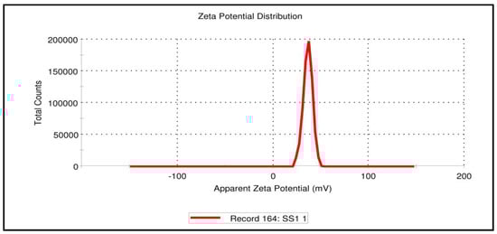 As shown in Figure 8, zeta potential measurement of SGN–TC nanoparticles (F3) was found to be 36 mV with positive charge. The positive charge of the prepared nanoparticles may be due to the unreacted amino group in the chitosan polymer []. An earlier study revealed that positively charged particles could increase electrostatic interactions with the negatively charged mucin present in the mucosal surface, thus leading to improved bioavailability and reduced side-effects []. The result was in full accordance with Mahdizaden et al. who found that the values of zeta potential of the prepared insulin thiolated chitosan nanoparticles were positive [].