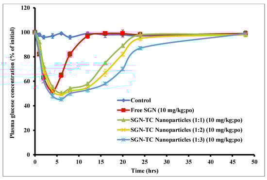 The in vivo study of prepared SGN–TC nanoparticles (F1–F3) was done in STZ-induced diabetic rats in comparison to free SGN. As shown by Figure 10, SGN–TC nanoparticles gave a prolonged antidiabetic effect compared to free SGN. The free SGN exhibited a reduction in blood glucose level and the antidiabetic effect was maintained for only 6 h, while the hypoglycemic effect of prepared SGN–TC nanoparticles was prolonged for more than 24 h. The prolonged effect of SGN–TC nanoparticles may be attributed to the mucoadhesive properties of TC nanoparticles which resulted in adhesion of nanoparticles to the mucus gel layer []. The prolonged release of SGN–TC nanoparticles is significantly more effective than the immediate release of free SGN in reduction of blood glucose levels.