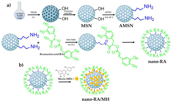 Schematic representation of the preparation of morin-loaded nanoantioxidants (nano-RA/MH). (a) Schematic path to obtain the antioxidant nanocarrier (nano-RA) and (b) schematic representation of the loading of morin in the nano-RA (nano-RA/MH).