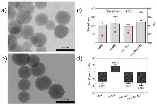The homogeneity of nanosystems was corroborated through the morphological features of nanomaterials obtained by TEM images (Figure 2a,b), where the particles were monodisperse porous spheres with a size of ca. 150.9 ± 18.6 nm; the surface functionalization does not affect the morphological features of studied nanosystems. In addition, the TEM images revealed that the nanoparticles are characterized by regular and well-ordered parallel pore channels, with a pore diameter ~3.1 nm, in agreement with those reported by other authors [37]. For bare MSN and nano-RA, the BET surface area determined were 840 m2·g−1 and 267 m2·g−1 (Table 1); this change, as expected, suggests that the RA molecules are linked in both the pore and outer surface of the nanoparticles. It is expected that this disposition of the RA molecules can affect the amount of MH loaded and its subsequent release, due to a greater interaction between RA/MH than MH/MSN. In fact, these results are consistent with the high drug loading of MH (23% w/w) in nano-RA compared to bare MSN (9% w/w).