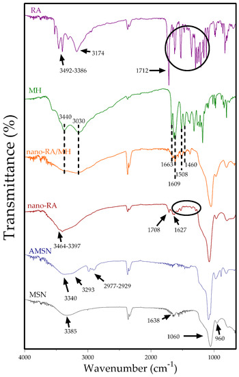 After amino-functionalization, AMSN (blue line) showed four important peaks at 3340, 3293, 2977, and 2929 cm−1, where the former two are related to NH2 stretching vibration and the last two peaks are attributed to the C–H stretch of aminopropyl chain of APTES [49]. The RA spectrum (purple line) indicates the main peaks at 3492 and 3386 cm−1 attributed to stretching of free –OH groups of RA, and the peaks at 3174 and 1712 cm−1 are due to –OH stretching and –C=O stretching vibration of carboxylic acid, respectively. Also, the spectrum showed the characteristic fingerprints of RA, where the principal peaks at 1648 cm−1 and 1517 and 1471 cm−1 were assigned to –C=O stretching of conjugated carbonyl group and stretching related to the aromatic ring, respectively. The nano-RA spectrum (red line) also exhibits several of the characteristics peaks in the fingerprint zone (1521 and 1458 cm−1) and the presence of a broad band (3510–3100 cm−1) due to –OH stretching and two weak peaks at 3464 and 3397 cm−1 due to free –OH of RA. Additionally, two differences are crucial when comparing nano-RA spectrum to the AMSN and RA spectra. First, the absence of the peak corresponding to vibration of the –OH of carboxylic acid, and secondly, the presence of two new bands at 1708 and 1627 cm−1 attributed to (–C=O) amide I and (–C-N) amide II, due to the formation of amide bond between NH2 of APTES and carboxylic acid of RA, confirming the successful grafting of RA onto the surface of mesoporous silica nanoparticles [16]. On the other hand, in the MH spectrum (green line) were highlighted bands at 3440–3030 cm−1 of the –OH group of morin, at 1663 cm−1 of –C=O of the carbonyl group in the C ring of morin, and the peaks at 1609, 1508 and 1460 cm−1 attributed to C=C stretching vibration in the aromatic ring. The same previous peaks are present in the nano-RA/MH spectrum (orange line), suggesting the presence of morin in the surface of nanomaterial (considering the external zone of pores).