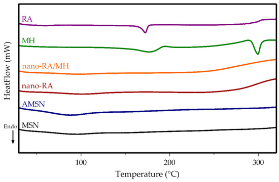 The curve corresponding to pure MH displays a sharp endothermic peak at 296 °C, which corresponds to the intrinsic melting point [50]. However, this peak did not appear in the nano-RA/MH sample, indicating that the MH was in a noncrystalline state when incorporated into the nanosystem, both in the pore and onto the surface interacting with the grafted RA; this molecular interaction favors the solubility of MH. Additionally, pure RA displays a sharp endothermic peak at 171 °C [51], but this peak, as expected, cannot be observed in the curve corresponding to nano-RA or the nano-RA/MH, due to the covalent interaction between RA and the surface of the mesoporous silica nanoparticles.
