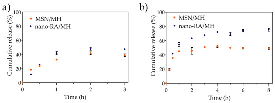 In vitro release profile of morin loaded in MSN (MSN/MH) and nano-RA (nano-RA/MH), in (a) simulated gastric fluid and (b) simulated intestinal fluid, at 37 °C.