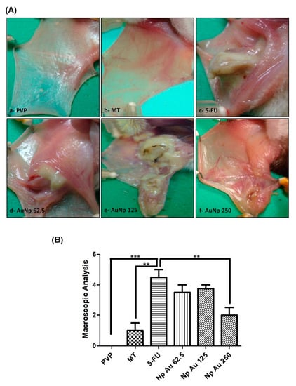 Figure 1. (A) Macroscopic analysis of the oral mucosa of hamsters (golden sirian) with oral mucositis (OM) induced by 5-fluorouracil (5-FU) and mechanical trauma (MT). PVP group: Animals with healthy, no erosion or vasodilatation of the oral mucosa, these hamsters only received PVP solution via i.p. (It is appropriate) or 10 days (a). Mechanical trauma (MT) group: Animals submitted to excoriation on the 10th day of the experimental model, the oral mucosa showed vasodilation and erythema (b). The 5-FU group: Animals that developed OM by administering 5-FU (IP) and mechanical trauma, the group showed oral mucositis characterized by ulcer formation, severe erythema, and vasodilation (c). The groups with OM treated with AuNp 62.5 (d), 125 (e), or 250 µg/kg (IP) (f). The animals treated with AuNp 250 µg/kg had mild vasodilation and superficial erosion in the oral mucosa, with no evidence of ulcers. (B) Score graph with the standard error of the mean (n = 5/group). ** p < 0.001; *** p < 0.0001 (Kruskal–Wallis test and Dunn’s multiple comparison test).