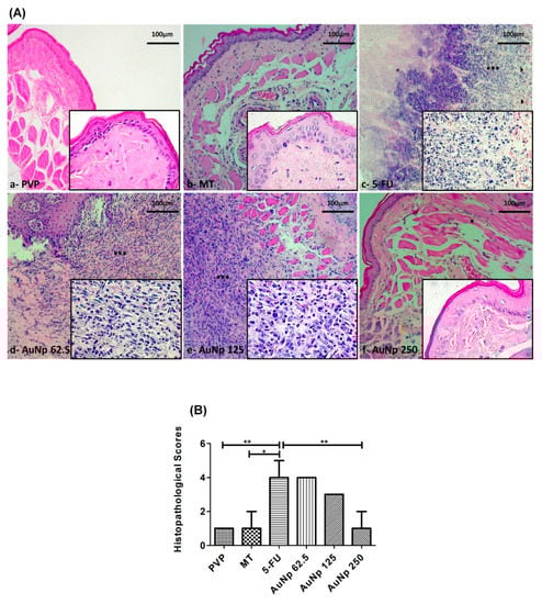 Figure 2. (A) Histopathological analysis of oral mucositis in hamsters on the 10th day of the experimental model. PVP group: Animals with normal tissue aspect (a). MT group: Animals without oral mucositis. (b). Group 5-FU: Animals with OM induced by 5-FU (c) and mechanical trauma, the oral mucosa showed areas of epithelial degeneration, hemorrhagic foci (►), intense inflammatory infiltrate (***), and regions suggestive of necrosis. Groups treated with AuNp 62.5 (d) or 125 µg/kg (e) did not improve oral mucositis. The group treated with AuNp 250 μg/kg (f) showed re-epithelialization with focal areas of inflammatory infiltration (*). (B) Score graph with the standard error of the median (n = 5/group). * p < 0.05; ** p < 0.001 (Kruskal–Wallis test and Dunn’s multiple comparison test).
