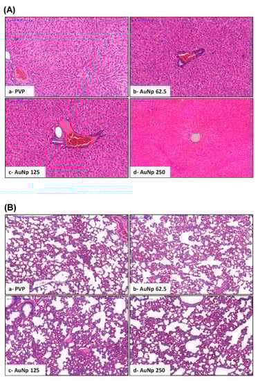 Histopathological analyses of hepatic and pulmonary specimens of animals with oral mucositis treated for 10 days at doses of 125 and 250 μg/kg of AuNp showed no pathological alterations (Figure 3A,B). The hepatic transaminases, TGO and TGP, were within the normal range (data not shown), similar to the PVP group. Additionally, the quantification of gold in the tissues revealed that the concentration of this metal in the lung was below the detection limit, <0.0017 mg/L, indicating the low capacity of this organ to accumulate gold nanoparticles under the experimental conditions used. However, liver samples of animals treated with a 125 ug/kg dose of AuNp resulted in a concentration of 0.012 mg/L while for animals treated with 250 ug/kg, a higher level of gold was found as 0.063 mg/L