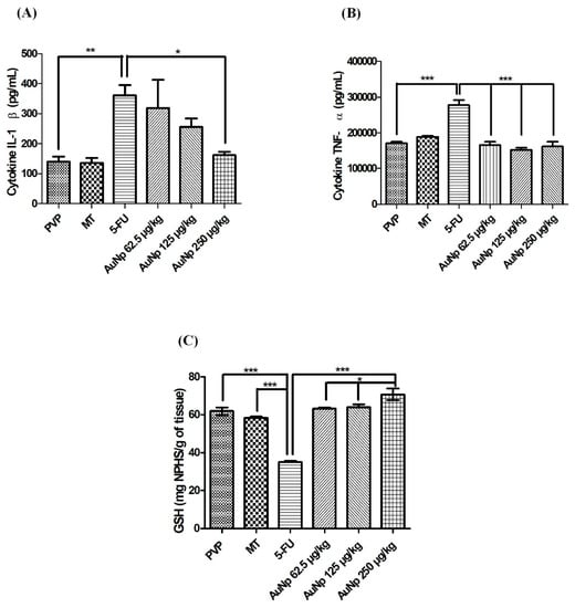Figure 4. Quantification of interleukin 1 beta (IL)-1β (A), tumor necrosis factor alpha (TNF)-α (B), or glutathione (GSH) (C) in the oral mucosa on the 10th day of the experimental model of oral mucositis in hamsters. The PVP group: Animals without OM. The mechanical trauma (MT) group: Hamsters that received excoriations on the oral mucositis. The 5-FU group: Animals received 5-FU and were subjected to MT. The AuNp groups received 5-FU, were subjected to MT, and were treated with AuNp (IP) at one of three doses (62.5, 125, or 250 µg/kg). (n = 5/group). The results are presented as the mean ± standard error of the mean, (n = 5/group). * p < 0.05; ** p < 0.001; *** p < 0.0001 (analysis of variance with Tukey’s post-test).