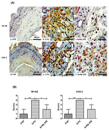 Figure 5. (A) Immunohistochemistry and (B) scores for NF-κB or COX-2. The PVP group with reduced immunostaining. The inflammatory cells of the oral mucosa in the 5-FU group had intense labeling for NF-κB or COX-2 compared to the PVP animals. In contrast, AuNp at 250 µg/kg reduced the immunostaining for NF-κB or COX-2, compared to the 5-FU group. (n = 5/group). * p < 0.05; *** p < 0.0001 (Kruskal–Wallis test and Dunn’s multiple comparison test).