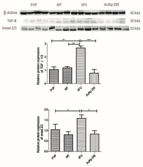 Expression of tumor growth factor β 1/2 (TFG-β 1/2) increased in the 5-FU group relative to the PVP group (** p < 0.001 vs. PVP). Animals with oral mucositis treated with gold nanoparticle (250 μg/kg) presented significantly lower levels compared to the 5FU group (*** p < 0.0001 vs. 5-FU). Treatment with AuNp (250 μg/kg) resulted in a reduction of SMAD 2/3 protein compared to the group with untreated oral mucositis (5-FU) (* p < 0.05 vs. 5FU) (Figure 6).